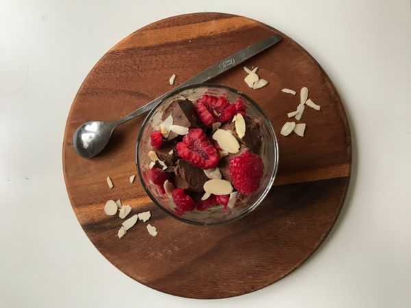 Рецепт raw брауни с нежным пудингом, малиной и миндалём